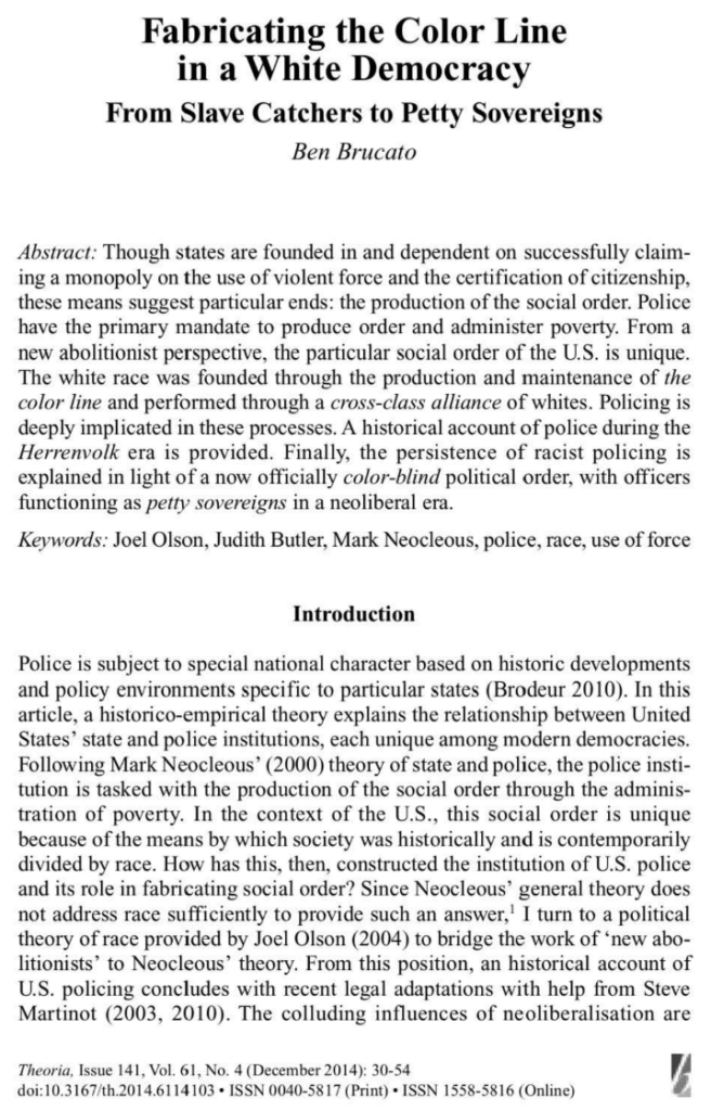 This article develops a historico-theoretical account of U.S. policing as a distinctive state institution whose enduring mandate is the production of social order through racial domination. Building on Mark Neocleous’s theory of police as an institution tasked with producing order and administering poverty, the article argues that the specific order produced in the United States is inseparable from the construction and maintenance of the color line. Drawing on Joel Olson’s account of the United States as a white democracy, it shows how white citizenship and cross-class white solidarity have depended on coercive control of Black life and political possibility.